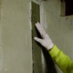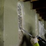 Because the wall had bottom shear sliding, shear pins with core fill were added to stop further movement. Horizontal straps were also installed beneath basement windows to reinforce weakened areas.