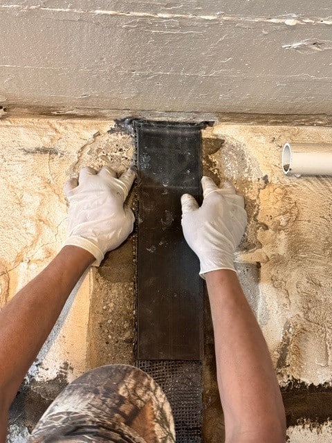 To restore structural integrity, they re-poured missing sections of the footer and reinforced the bowing front wall with Fortress InvisiBeam® straps, anchored into the concrete porch slab above. The damp wall was dried with a blow torch to ensure epoxy adhesion, and horizontal cracks were sealed with hydraulic cement.