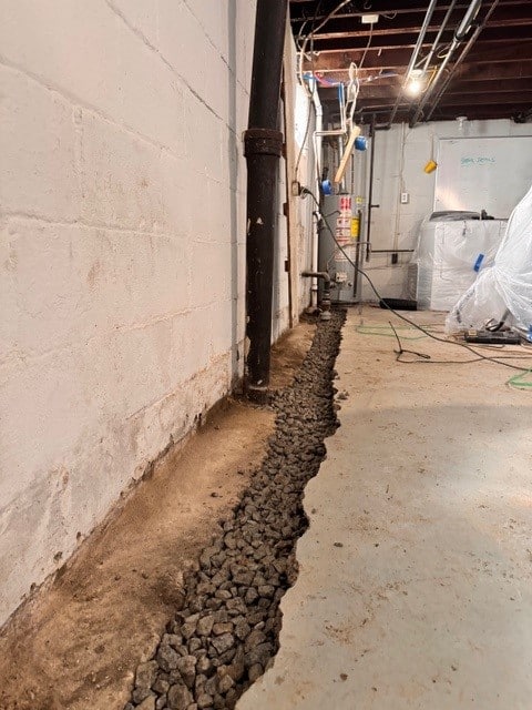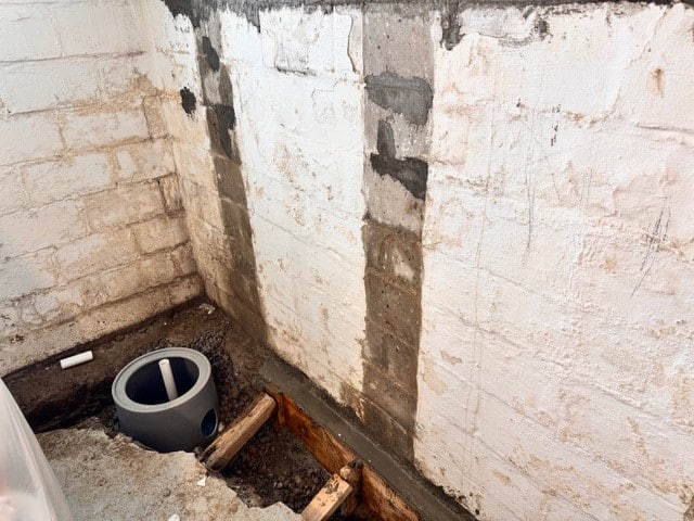 Highlander Waterproofing, a Fortress-authorized contractor, was hired to correct the failed system and stabilize the home. They removed the old waterproofing and installed a new drain tile system, sump basin with battery backup, and drilled weep holes to properly manage water.